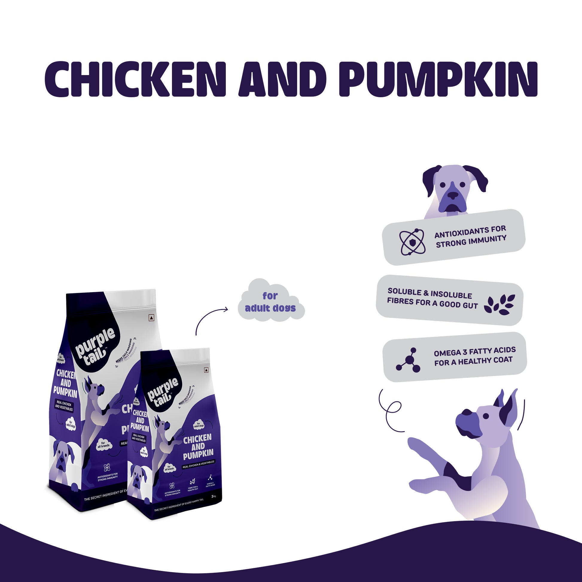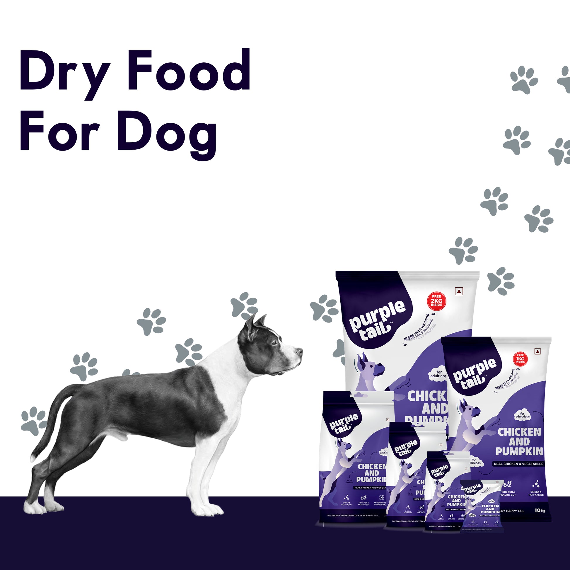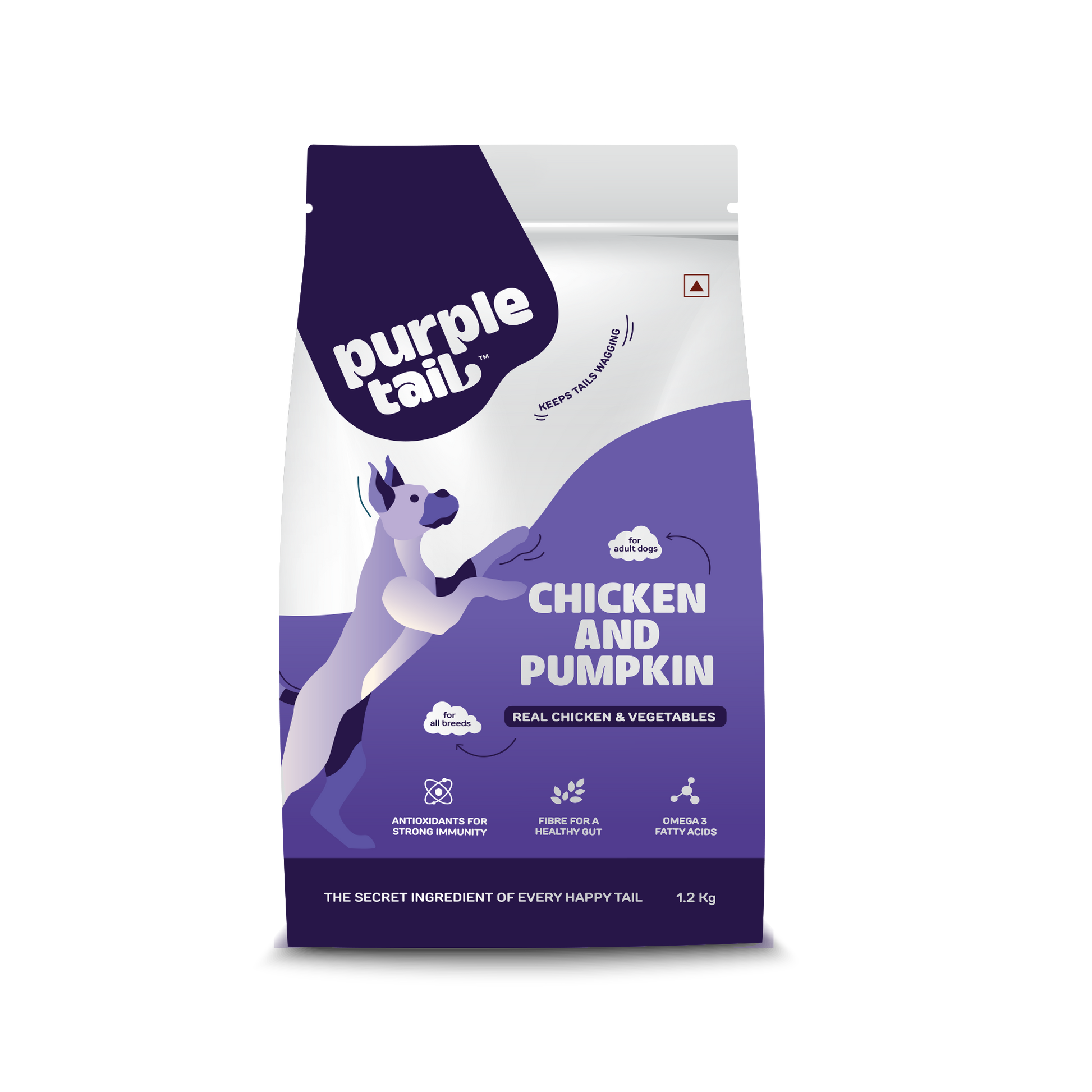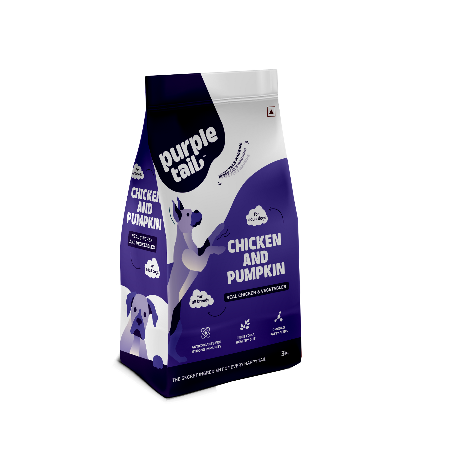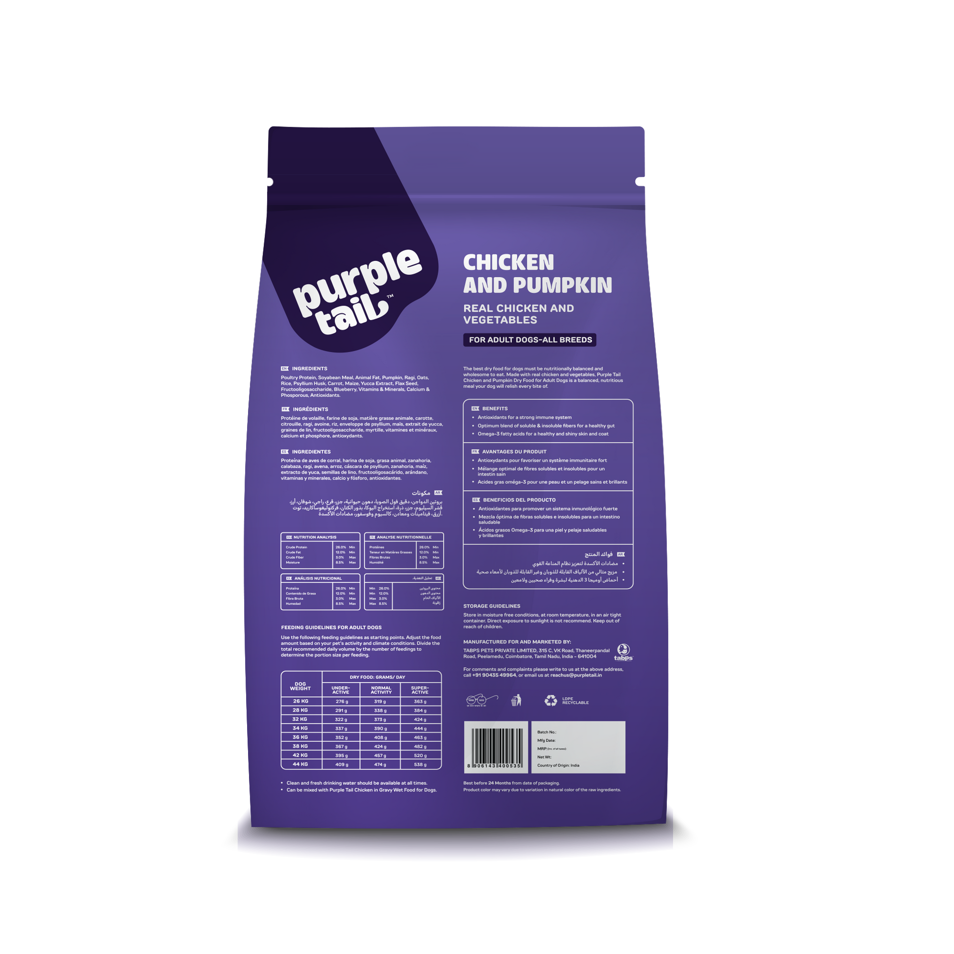 The best dry food for dogs must be nutritionally balanced and wholesome to eat. Made with real chicken and vegetables, Purple Tail Chicken and Pumpkin Dry Food for Adult Dogs is a balanced, nutritious meal your dog will relish every bite of.