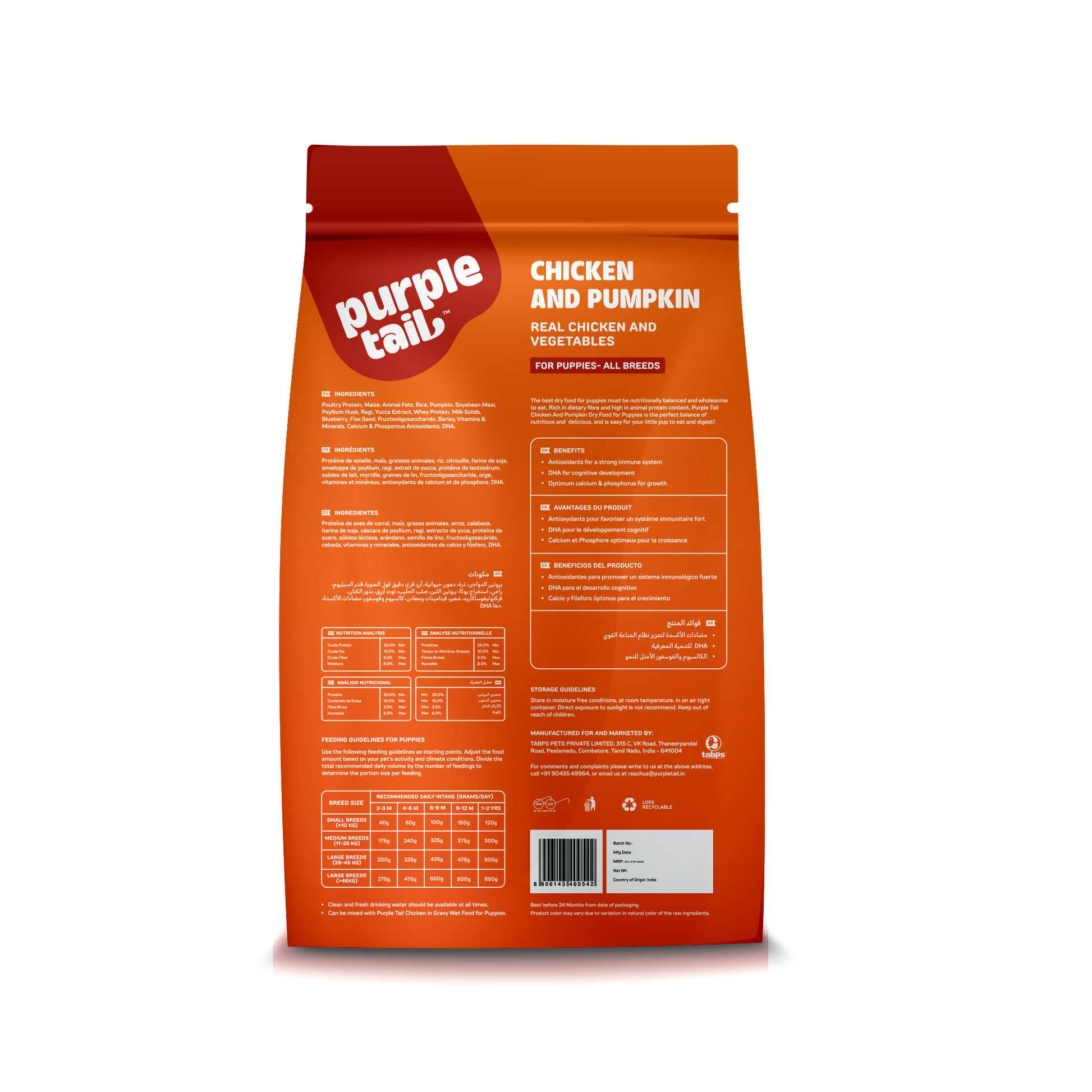 The best dry food for puppies must be nutritionally balanced and wholesome to eat. Rich in dietary fibre and high in animal protein content, Purple Tail Chicken And Pumpkin Dry Food for Puppies is the perfect balance of nutritous and delicious, and is easy for your little pup to eat and digest!